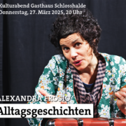 In der Schlosshalde pickt sie Rosinen aus ihrem vielseitigen Repertoire. Mal zungenbrecherisch, mal zarthalsig, mal vollmundig. Das dritte Jubiläum verrät sie uns vielleicht in der Fragerunde. Auf diese freut sie sich ganz besonders, denn Tabus gibt es für die Wahlwinterthurerin nicht.